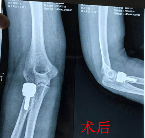 考虑到患者系粉碎骨折,科室立即组织会诊讨论,最终决定由副院长杜敏指导,科室副主任张延平主刀,主治医师王陇协助行人工桡骨小头置换术,手术过程顺利,无并发症发生,术后患者病情平稳。目前患者前臂已行旋转功能锻炼,恢复良好。