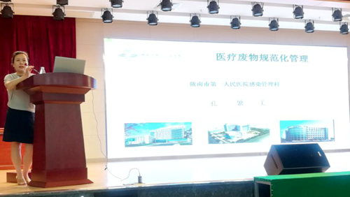 培训由院感科孔繁美科长以《医疗废物规范化管理》为题展开,培训内容紧扣《医疗卫生机构医疗废物管理办法》、《医疗废物管理条例》的相关内容进行了详尽细致的讲解,并对医疗废物的管理中医务人员的责任与义务及医疗废物管理的分类、管理流程、医疗废物产生地收集的注意事项、医疗废物转运签字的具体细节进行系统化培训。随后,重点强调了护理人员是医疗废物产生地的收集、分类的第一责任人而不是病区保洁员;强调了各科室要重视医疗废物产生地的规范管理,从源头上切断医院感染的传播途径,做到医院感染防患于未然。