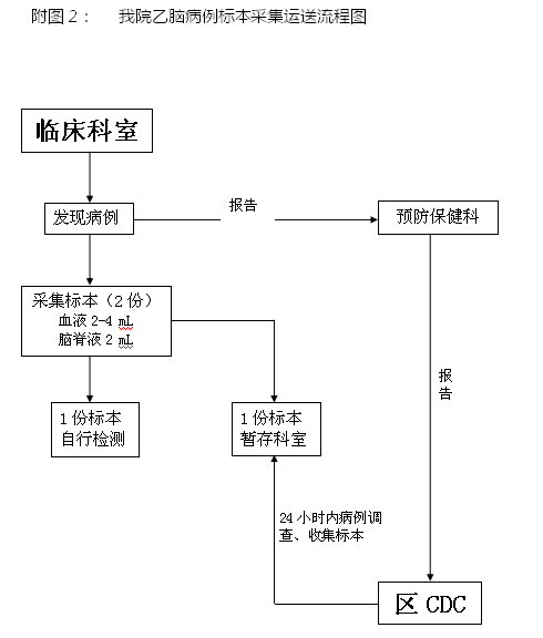 医疗机构要采集2份脑脊液和血液标本,其中1份供自行检测用,另1份供疾病预防控制机构检测。不能进行上述检测的医疗机构只需采集1份标本。门诊及病房采集的标本应转送本院检验科或化验室妥善保存,并立即报告辖区县级疾病预防控制机构,联系转运标本。检验科或化验室收集血液标本后,分离血清,保存血清标本。脑脊液、血清标本要求低温(-20℃以下)保存。标本要冷藏运送,同时要符合实验室生物安全和相关运输管理有关要求,流程见附图2。