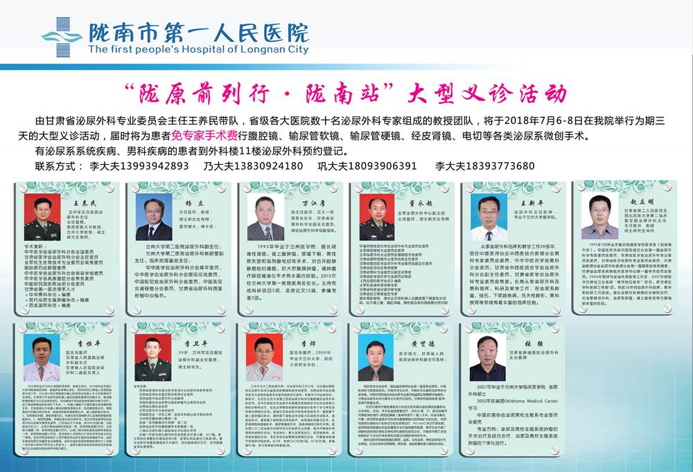 7月7日,由甘肃省医学会泌尿外科专业委员会主办,我院承办的甘肃省医学会泌尿外科专业委员会专家团队“陇原前列行—陇南站”大型义诊活动暨陇南市泌尿外科专科联盟成立大会在我院十八楼会议室隆重举行。