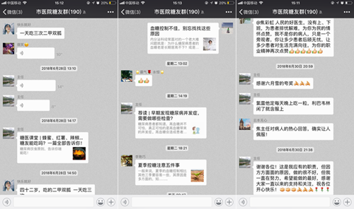 为了让患者了解和掌握糖尿病防治相关知识,减轻糖尿病患者的经济负担,得到正规管理,足不出户就能寻医问诊,近日,我院内分泌科创建了“陇南市医院糖尿病患者交流群”,利用微信平台所具有的实时性、互动性、便利性,定时向糖尿病患者发送内分泌科疾病的相关知识,在最短时间解决患者所需,及时解决患者反馈问题。目前群内患者已达到190余人,咨询人数每天达20余人,这一举措在患者中赢得了一致好评。
