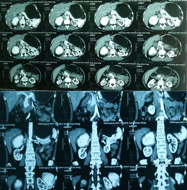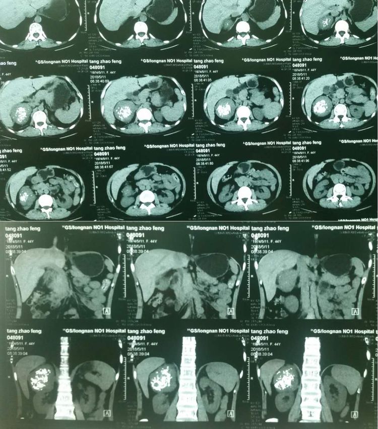患者女性,44岁,因"体检发现右肾上腺巨大肿物2天"入院。入院后积极完善相关检查,CT平扫显示:患者右肾上腺区直径约6.5X6.1cm肿物,CT值约27-35Hu,中央见多发不规则钙化灶,增强扫描病灶明显强化。
