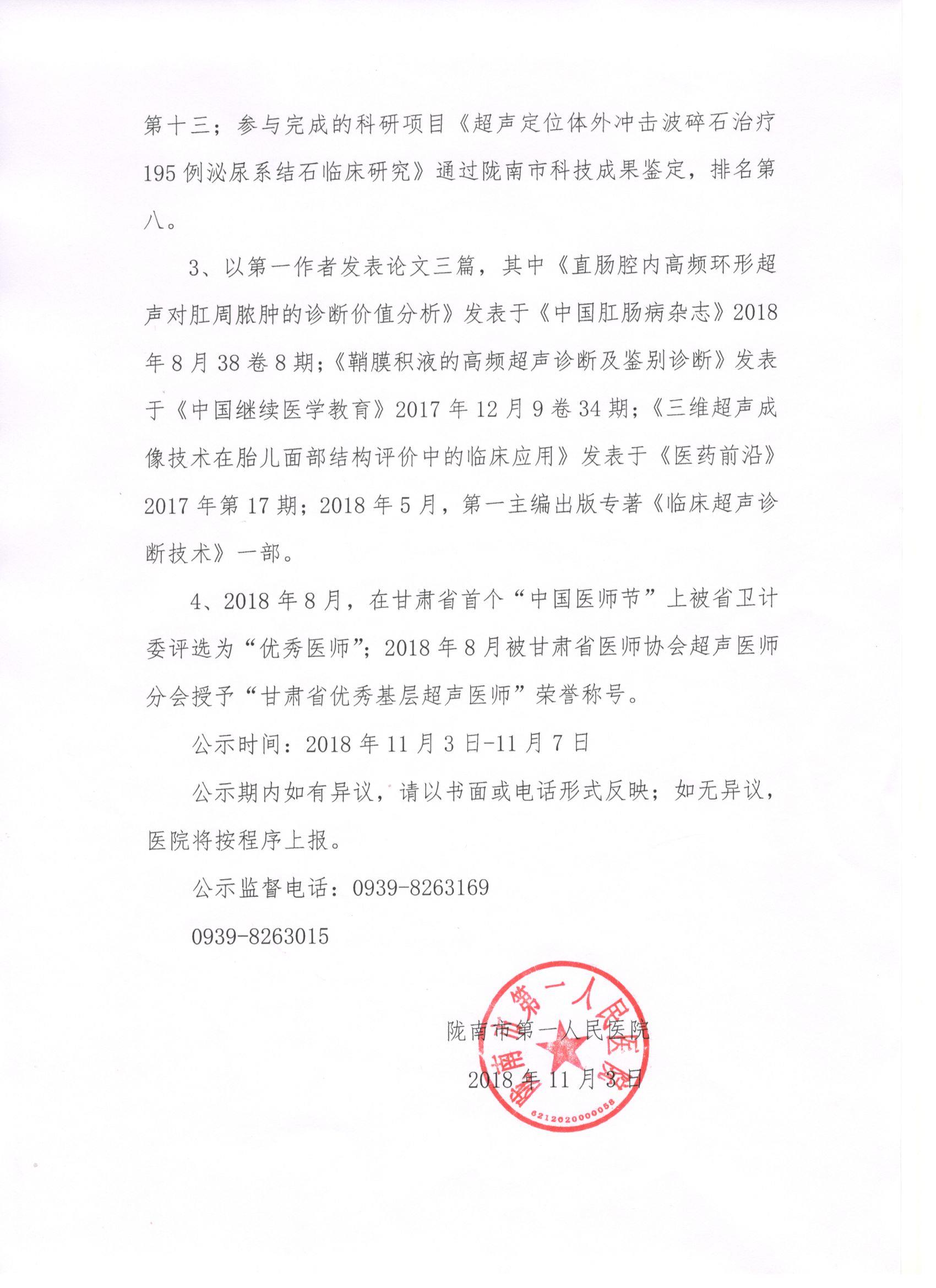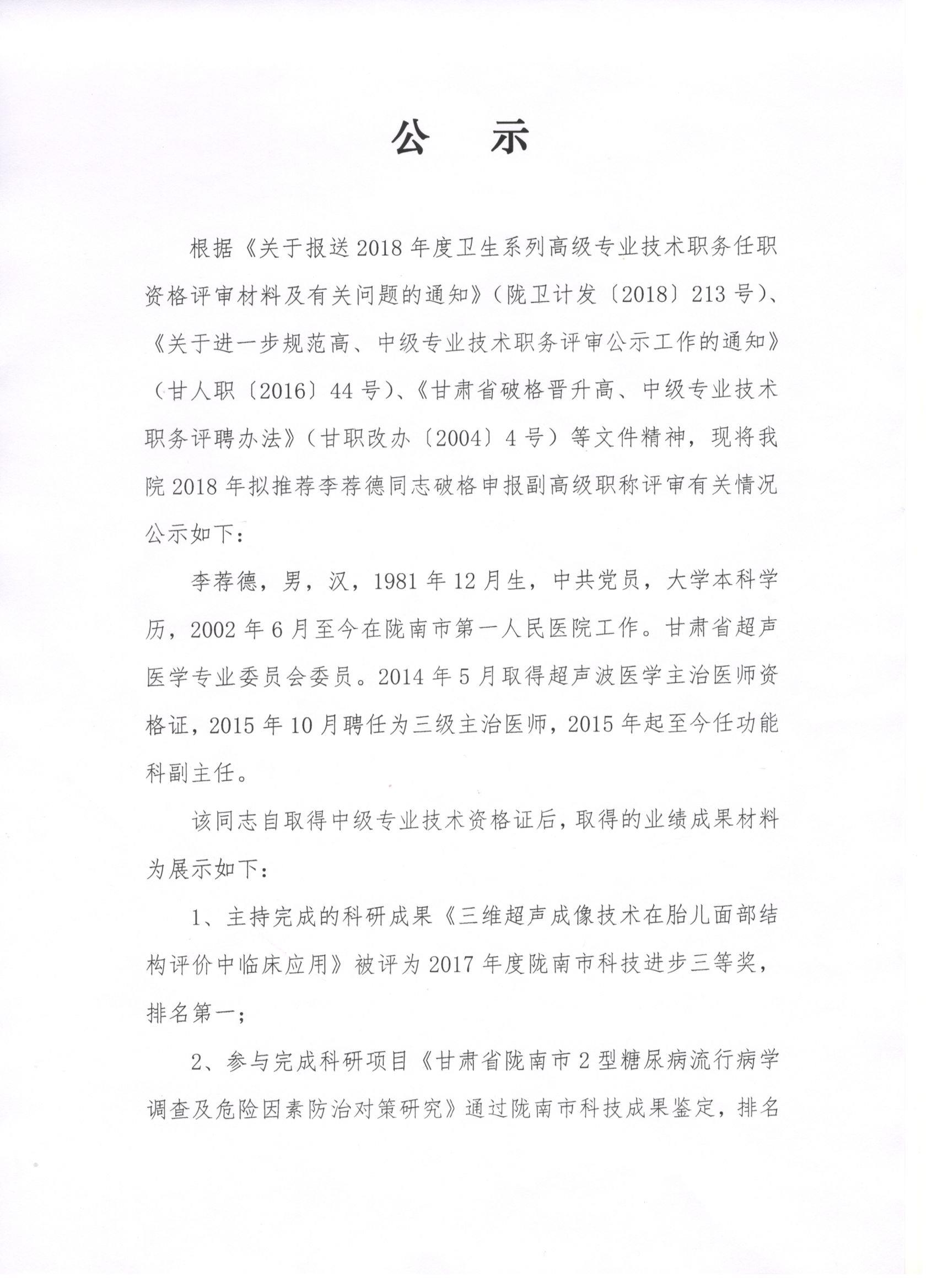 关于推荐李荐德同志破格申报2018年卫生系列副高级职称评审有关情况的公示