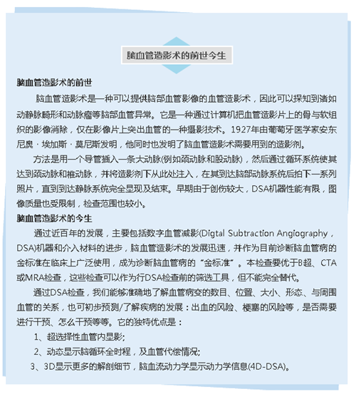 脑血管造影术即脑血管造影检查是一种介入检查方法,主要利用X光无法穿透显影剂的特点,来诊断脑血管病变,可以清楚显示血管形态,如狭窄、闭塞、血管畸形、侧枝循环情况及有无动脉瘤、静脉窦血栓形成等,是确诊颅内血管病的“金标准”,同时也是脑血管病介入治疗的重要基础依据。