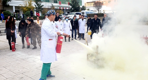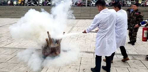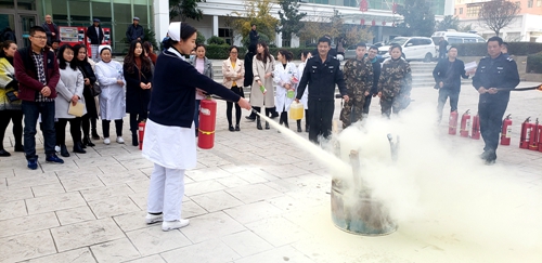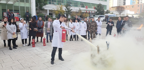 培训结束后,为了使大家更好的掌握灭火逃生技能,吴教官在内科楼前面广场现场展示了灭火器的正确使用方法。在场的安全消防员积极参与,亲手操作,进一步提升了科室消防管理员应对初期火灾的扑救能力,使每一位安全消防员在接受教育同时也增强了自我本领,做到有备无患。