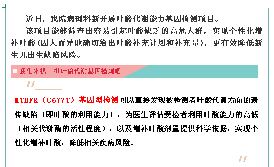 我院开展叶酸代谢能力基因检测,有效预防新生儿出生缺陷