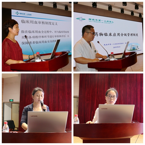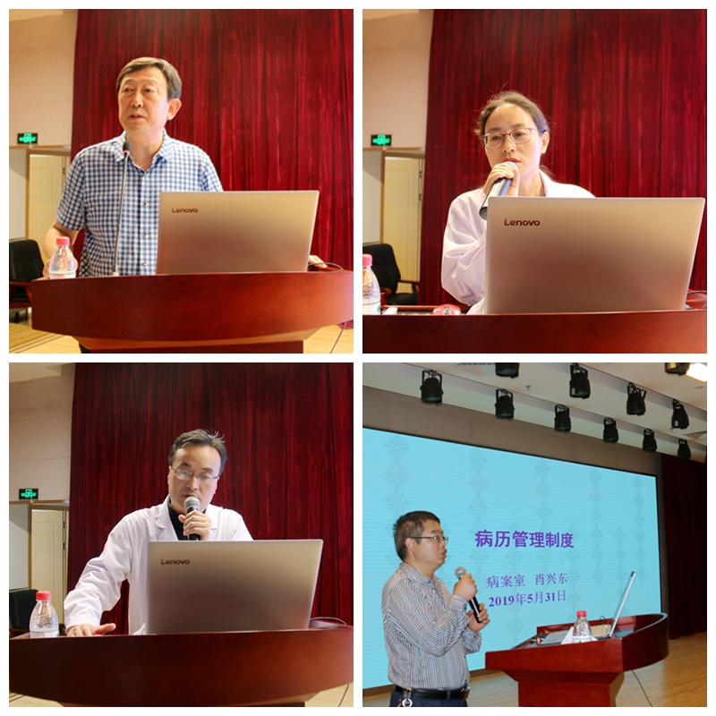 会上,副院长杜敏、内分泌科主任焦彩虹、神经外科二病区主任康宏达、手术麻醉科护士长董彩虹、病案室主任肖兴东、输血科主任魏晓燕、护理部护师罗娜、药剂科药师李斌分别就《首诊负责制度》、《三级查房制度》、《会诊制度》、《值班和交接班制度》;《疑难病例讨论制度》、《危急重症患者抢救制度》、《死亡病例讨论制度》、《危急值报告制度》;《手术分级管理制度》、《术前讨论制度》、《新技术和新项目准入制度》;《手术安全核查制度》;《病历管理制度》、《信息安全管理制度》;《临床用血审核制度》;《分级护理制度》、《查对制度》以及《抗菌药物分级管理制度》为讲解内容并结合自身临床经验对十八项核心制度进行了深刻剖析,使参会人员充分理解了各项核心制度要点的含义。