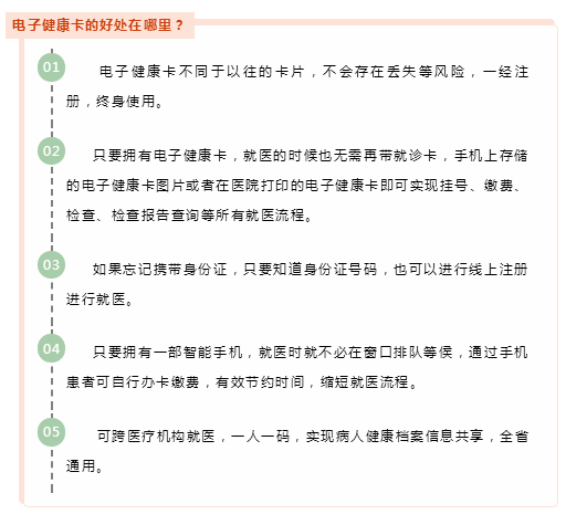 电子健康卡采用全省统一编码规则,支持跨医院、跨地区就诊,再也不用去一个医院就要办一张卡啦~