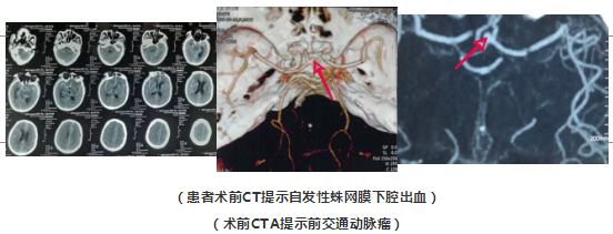 患者,64岁,主因“突发性头痛、头晕5小时”急诊来我院救治,院前CT提示自发性蛛网膜下腔出血。入院时患者已出现意识障碍,生命垂危。接诊后康宏达主任高度重视,行CTA检查,明确为前交通动脉瘤破裂出血,决定为患者实施颅内动脉瘤夹闭术。经过科学严谨的术前准备,主治医师宋凯积极统筹联系,邀请兰大二院神经外科高俊玮教授现场指导,康主任携宋凯、冉军民两位主治医师为患者成功实施了开颅动脉瘤夹闭术。