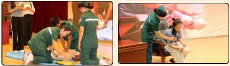 培训中,李海霞老师就《气道异物梗阻的急救》知识详细讲解了成人和婴儿异物梗塞的急救流程和方法,并亲自现场演示。演示结束后,会场所有人员两两组队进行了成人气道异物梗阻演练。李海霞老师就演练中不规范的操作进行纠正,并向大家分享了“剪刀、石头、布”的口诀(剪刀:即立位腹部冲击法的定位在脐上两指;石头:即一手握拳抵住脐上两指处;布:即另一手扣住握拳手)。