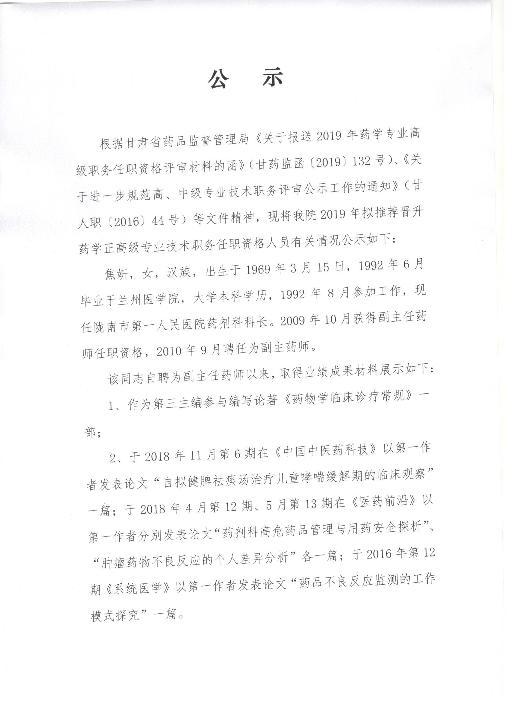 关于推荐晋升药学正高级专业技术职务任职资格人员的公示