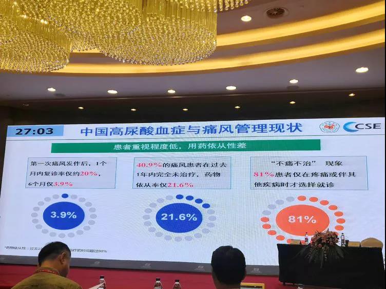 高尿酸血症、痛风是常见病、多发病,目前中国已有高尿酸血症患者1.8亿人,患病率为13.3%,有10-20%的高尿酸血症患者发展为痛风。高尿酸血症是代谢性疾病、慢性肾病、心血管疾病、脑卒中的独立危险因素,如果得不到及时规范的诊治,会引起诸多并发症。中国风湿免疫病医联体联盟最新的数据显示,痛风病人中伴有痛风石的比例达20.3%,造成患者及社会极大负担,90%以上的病人没有进行达标治疗,这些病人存在发展为痛风石、肾功能不全的巨大风险。