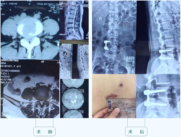 患者女性,48岁,因腰腿疼2年,加重3月收住我院骨一科。入科后查体示:腰4、5棘突及右侧椎旁轻压痛、叩击痛;按压右侧椎旁可有右下肢放射痛,右小腿外侧及足背外侧缘麻木,左下肢感觉及双下肢肌力未见异常,左下肢直腿抬高试验阳性(约45度),加强试验阳性,病理反射未引出,初步诊断为腰椎间盘突出(腰4-5)。科室立即组织医生详细评估、缜密讨论后,决定为患者行通道下椎间盘摘除、椎管减压及椎体间融合术(MIS—TLIF)+钉棒系统内固定术,手术顺利,术后患者恢复良好。