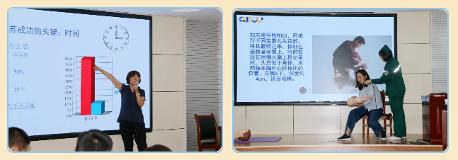 活动中,专家徐梅、李海霞结合案例分别为与会人员详细讲解了心肺复苏、呼吸道异物梗塞相关急救知识,图文并茂的课件、极富感染力的演讲赢得了现场听众的一致好评。