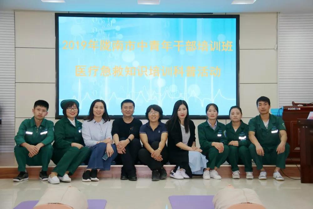 9月25日下午,2019年陇南市中青年干部医疗急救知识培训科普活动在市委党校报告厅举行,我院青岛市急救中心帮扶专家徐梅、李海霞,急救中心护士长周婕,护士刘志刚、石桂香、王璐、王飞飞受邀前往授课并现场演练急救常识。