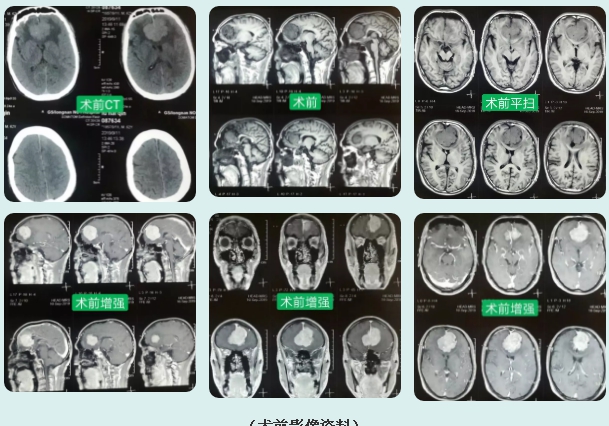 患者符某,男,69岁,主因“突发性抽搐后昏迷6小时”入院,入院后行颅脑CT提示:双侧额叶高密度影,考虑:双侧额叶占位。给予患者对症治疗,第二日神志转清,进一步完善颅脑MRI平扫+增强提示:双侧额叶大脑镰旁脑膜瘤。