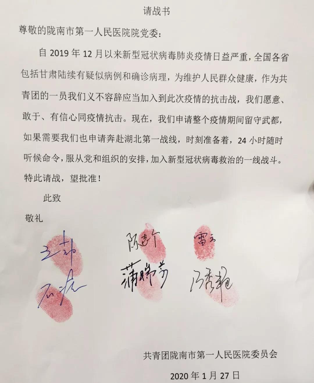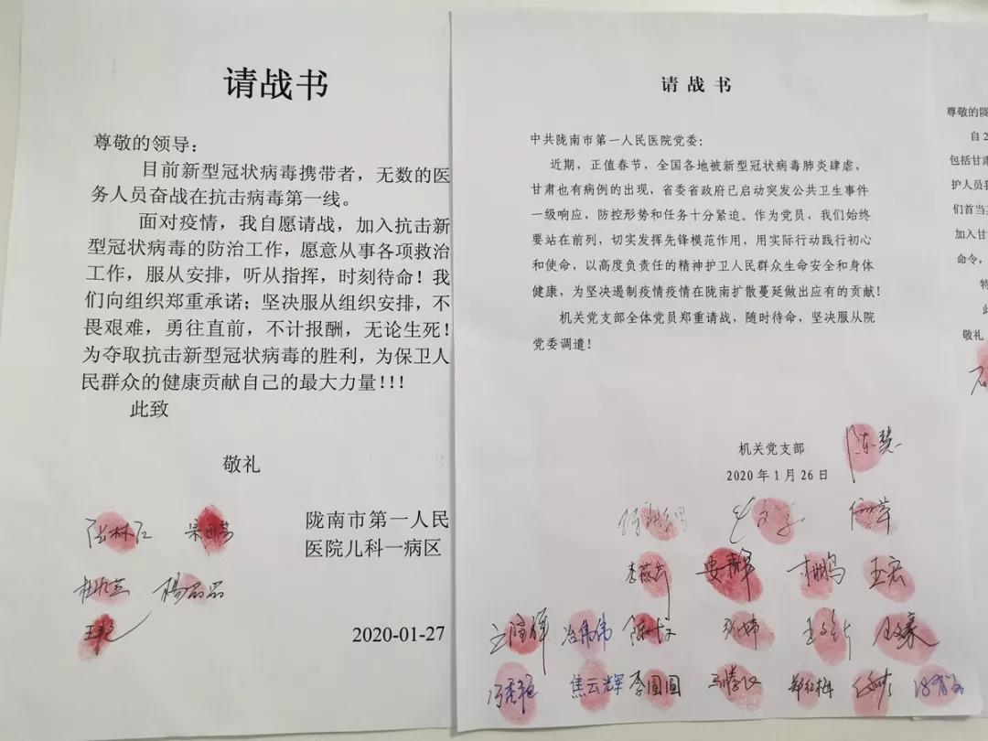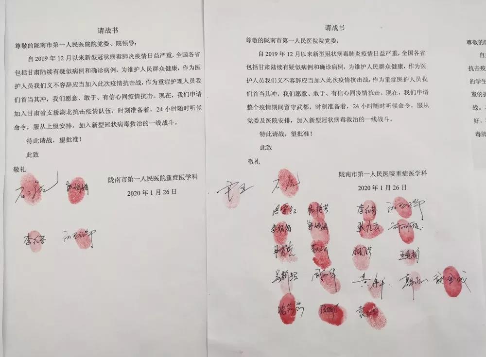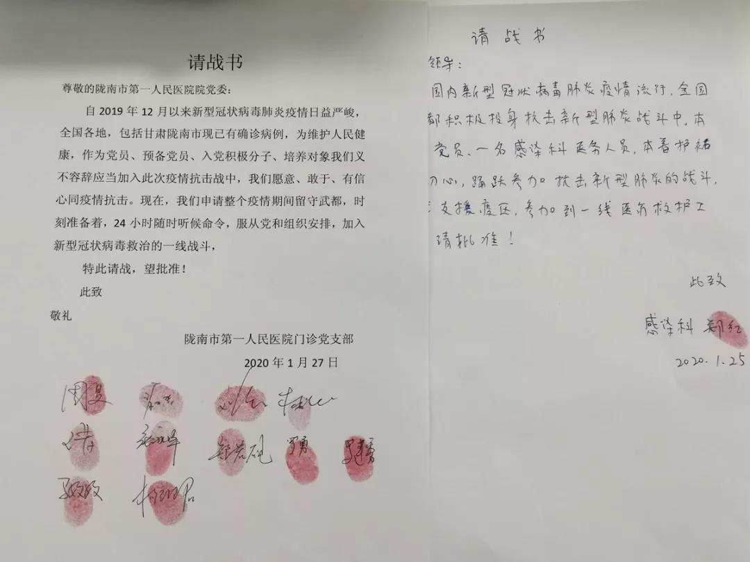 “坚守预防、发热门诊的第一线,圆满完成任务,一切后果自己承担”“我志愿加入抗击冠状病毒的一线”“我是学呼吸专业的,在一线能发挥所学”“随时听从党委的召唤”……从元月22日起,一封封请战书,一篇篇感人肺腑的请战文章,递交到陇南市第一人民医院党委办公室。
