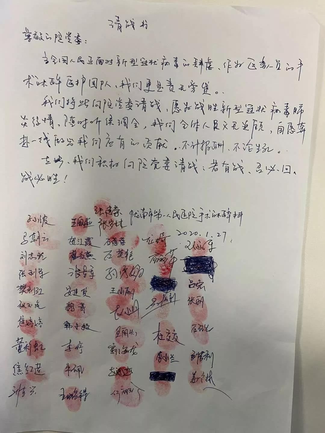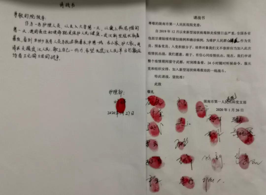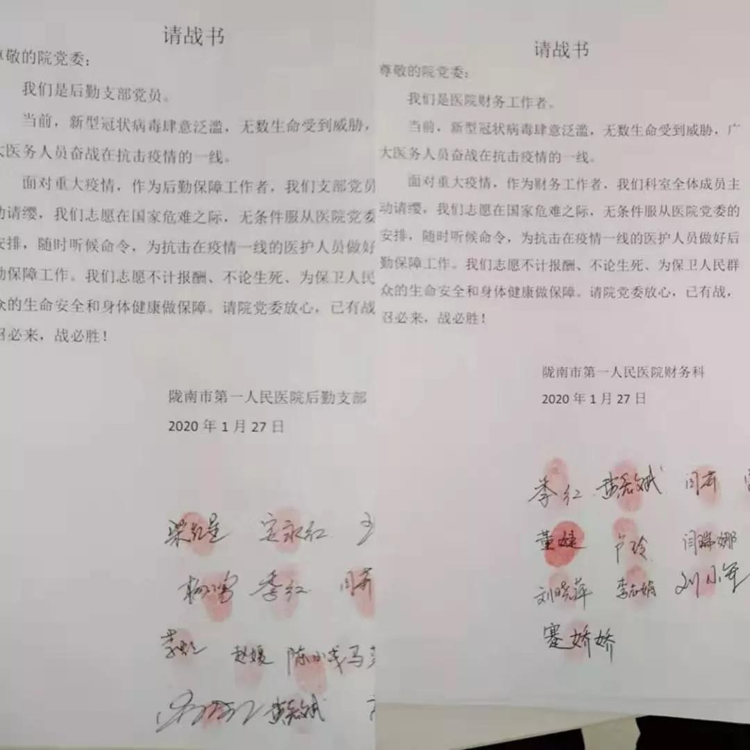 “坚守预防、发热门诊的第一线,圆满完成任务,一切后果自己承担”“我志愿加入抗击冠状病毒的一线”“我是学呼吸专业的,在一线能发挥所学”“随时听从党委的召唤”……从元月22日起,一封封请战书,一篇篇感人肺腑的请战文章,递交到陇南市第一人民医院党委办公室。