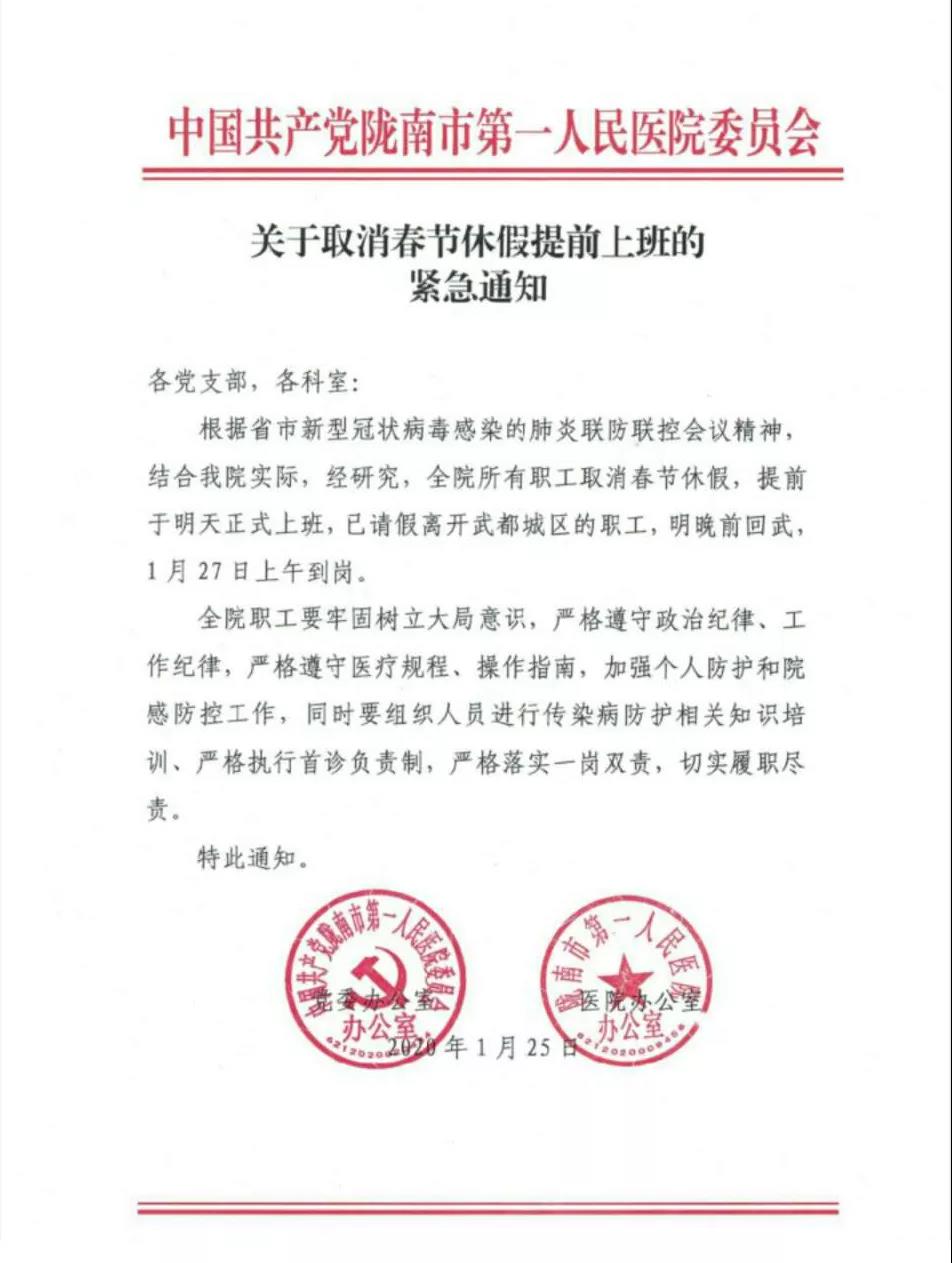 大年初二,火速召回全院职工,取消春节假期,返岗上班,为抗击疫情做好一切准备。