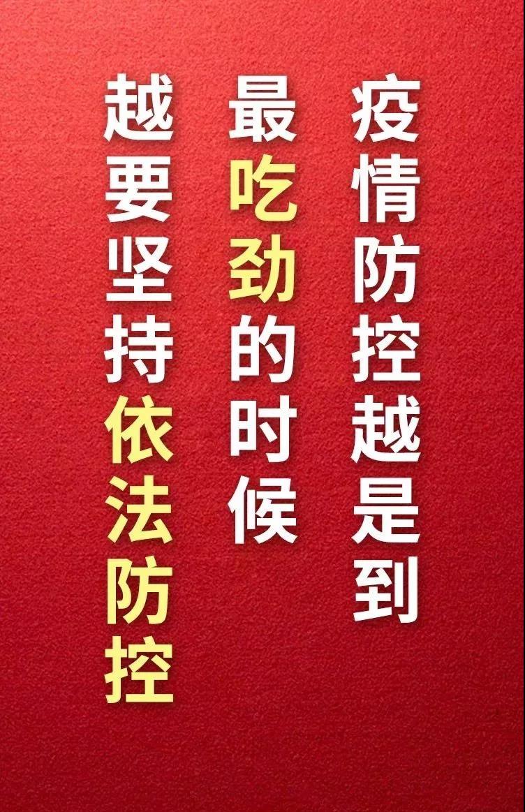 习近平在讲话中强调,当前,疫情防控正处于关键时期,依法科学有序防控至关重要。疫情防控越是到最吃劲的时候,越要坚持依法防控,在法治轨道上统筹推进各项防控工作,保障疫情防控工作顺利开展。