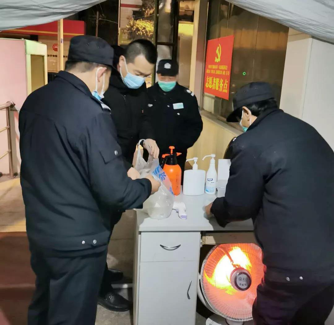 1月25日,正月初一,院党委召开党委扩大会落实省市新冠肺炎联防联控工作会议精神后,保卫科全体工作人员坚守一线,严格落实防疫隔离政策;1月29日,保卫科的同事们搭建体温检测点帐篷、搬运物资,直至晚上十点多,连夜完成了改造。