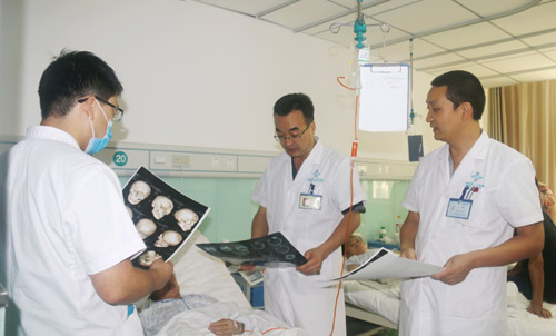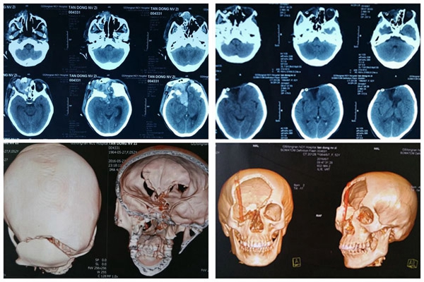 患者入科后情况十分危急,经检查右侧头面部变形,部分组织缺损,呼叫、刺痛无反应,活动性出血,眼球破裂、骨质及脑组织外溢,口鼻腔随呼吸喷出大量血性液体,脑疝形成,濒死状态。主治医师宋凯一边拟定手术计划,一边向科主任康宏达汇报。主任立即调动全科优势技术力量全力以赴,坐阵手术室,指导宋凯医师操作,张彦平、冉军民医师担任助手。完成在毁损伤的碎骨片及破碎脑组织中分离视神经,颈内动脉及海绵窦,处理及修复前中颅底骨质及窦腔,脑内清创等高难度精准操作,手术历时10个小时顺利完成。由于颅底解剖极其复杂,有重要血管和神经,损伤后极易出现生命危险。患者术后又经历颅内感染及脑脊液伤口漏等重重难关,但经过医护人员的精心治疗和护理,目前患者神志清晰,精神及营养状态佳,对答流利,思维及认知功能无障碍,肢体神经功能无缺失。