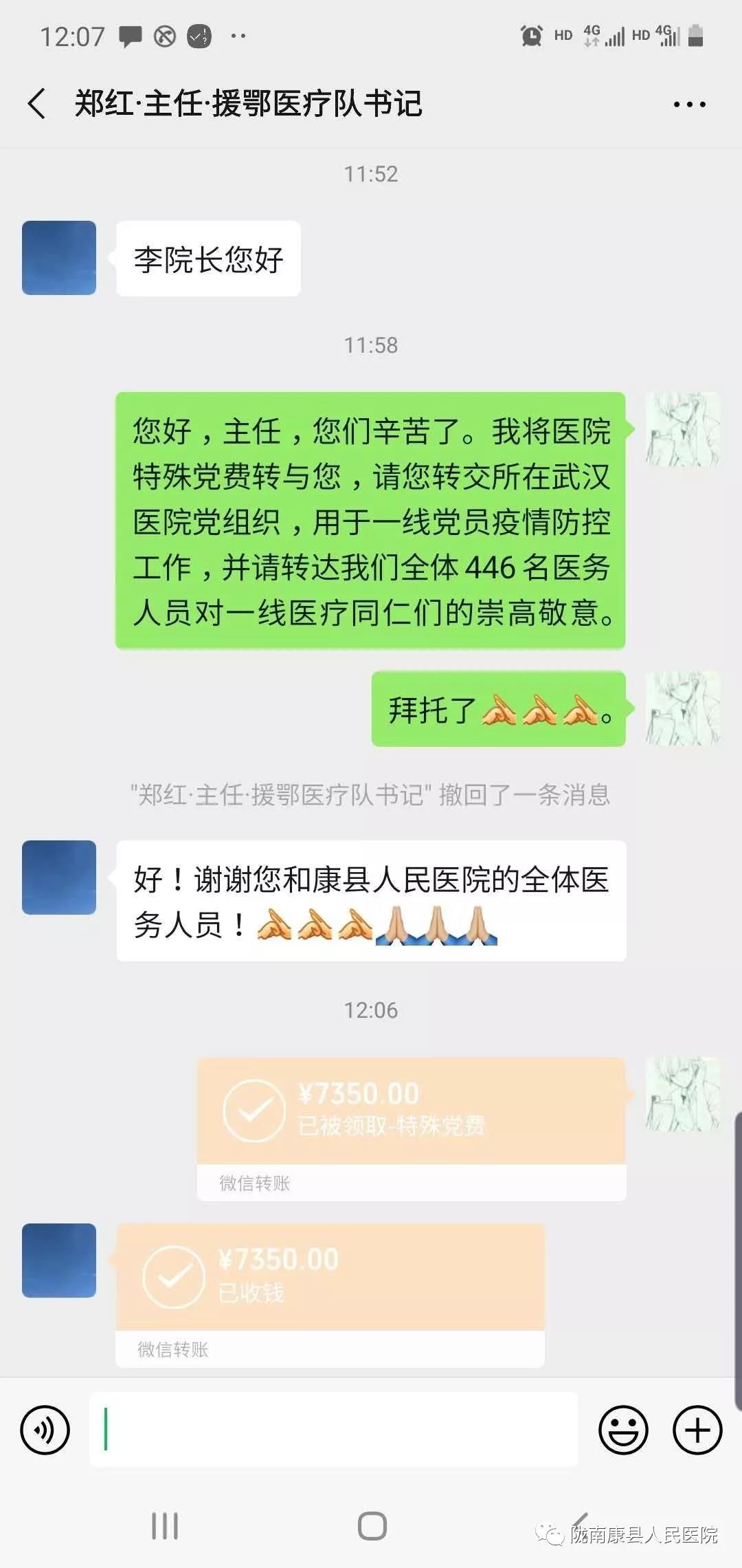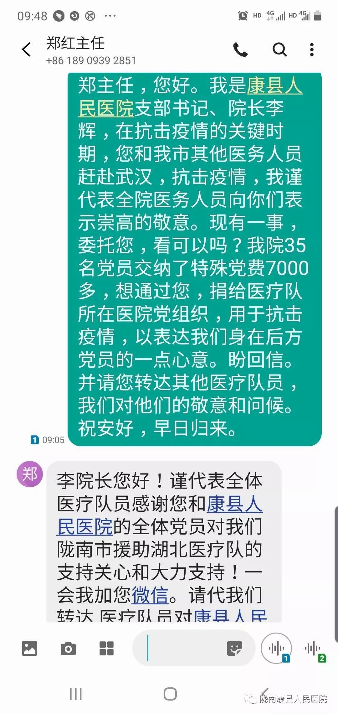 康县人民医院党支部书记、院长李辉委托援鄂医疗队临时党支部书记郑红,转达了康县第一人民医院全体党员和医务人员对援鄂医疗队及武汉一线医务人员崇高的敬意和问候,并祝福援鄂医疗队全体同仁早日战胜疫情,平安归来。
