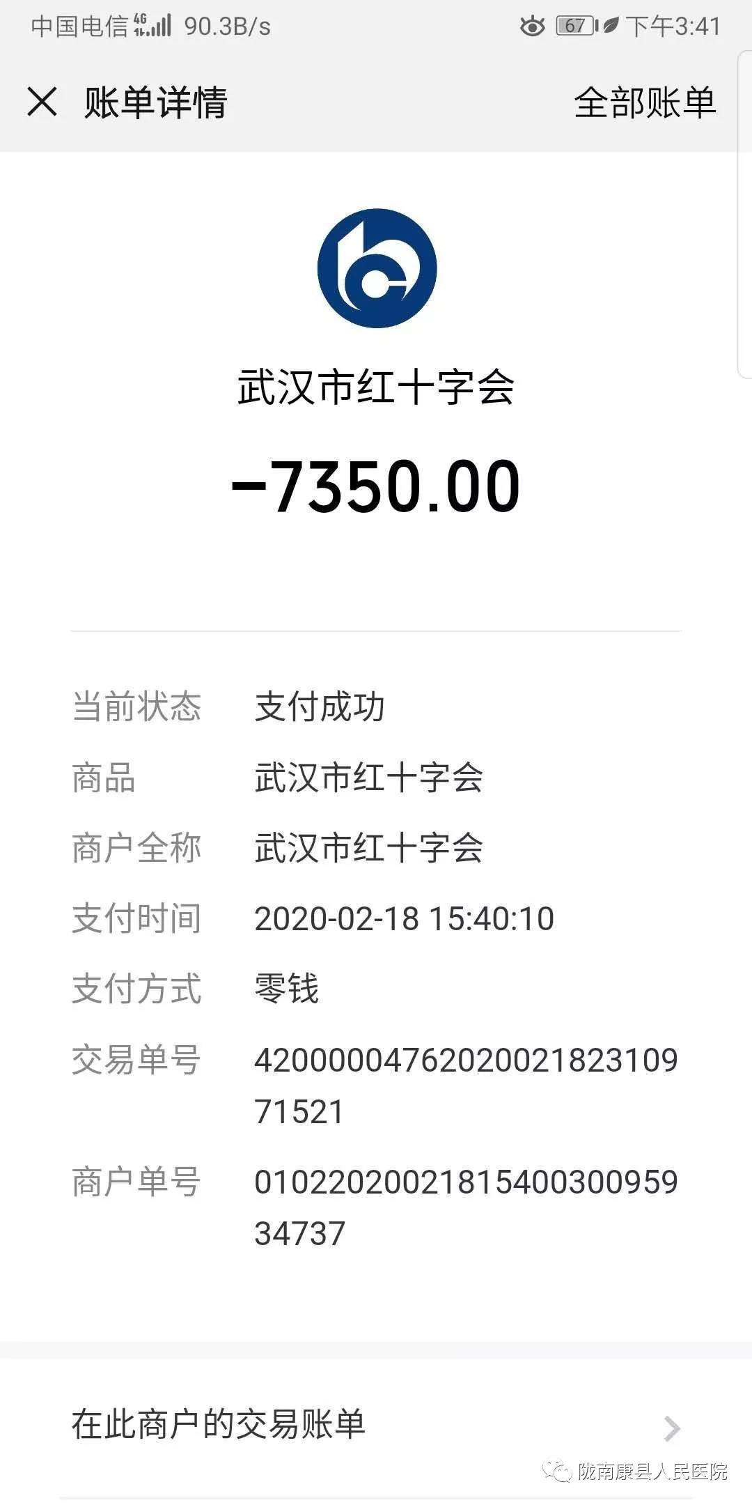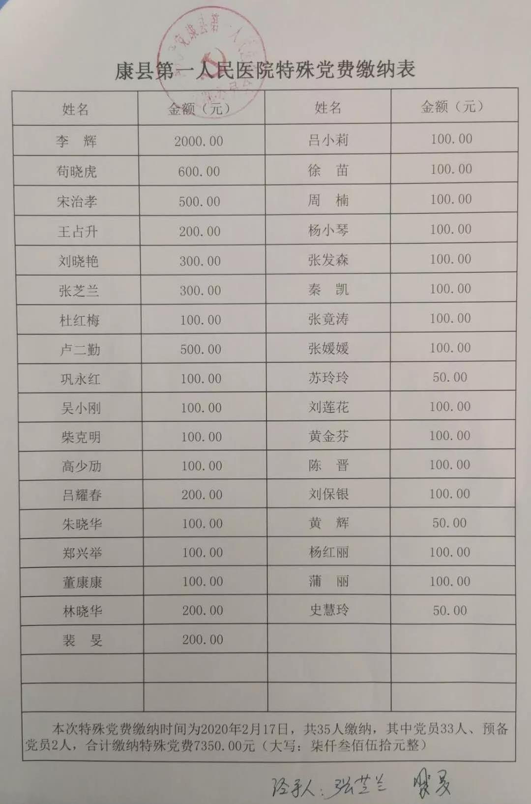 近日,在武汉疫情防控的关键时期,康县第一人民医院党支部全体党员自愿缴纳特殊党费7350元,通过陇南市援鄂医疗队临时党支部书记郑红转交武汉红十字会,用于武汉一线医务人员疫情防控工作。
