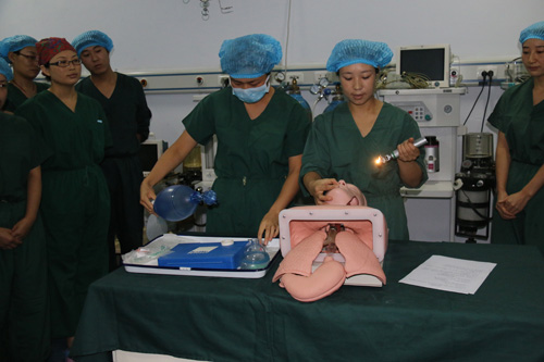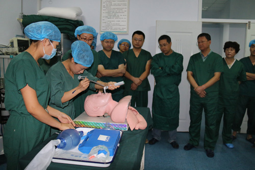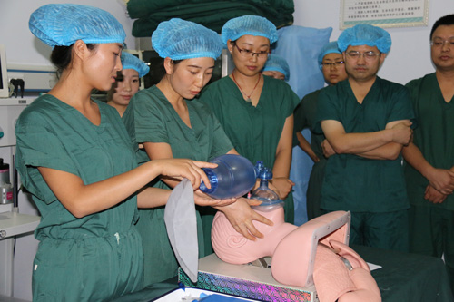 科主任李进元亲自任培训组组长,制定了周密的培训计划方案,麻醉科全体医师为指导教师,前后花费一个月时间,每天利用晨会和下午空闲时间对科室28位护士进行手把手,一对一,逐一指导。主要培训了双手托面罩,手法控制呼吸和模拟人气管插管等基本而重要的气道管理操作技术。培训过程首先是指导教师演示做,再边说边演示做,然后由学员说教师做,再学员自己边说边做,最后学员自我评价和相互评价,老师点评。培训过程既紧张,又轻松有序。医院领导对我科此次培训特别重视,在培训过程中冯旭副院长带领医务科李文灿科长、护理部郝金霞主任亲临现场观摩指导,对我科的培训工作给予肯定。