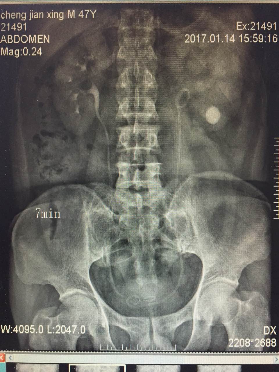 患者,男,47岁,间断性左侧腰背部疼痛不适8年,于当地医院诊断为左肾积水,左肾结石,曾行体外冲击波碎石治疗,无效,遂就诊于我院泌尿外科。完善泌尿系CT及静脉泌尿系造影后诊断为左肾积水,左侧输尿管狭窄,左肾结石,泌尿外科李朝明主任及其团队反复研究患者病情后决定行经尿道输尿管镜联合肾镜输尿管狭窄高压球囊扩张术,手术过程顺利,术后住院恢复治疗20天,目前已完全康复出院。