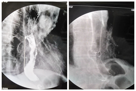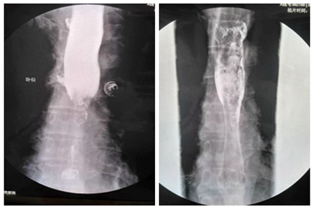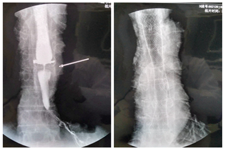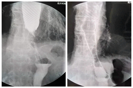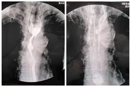 (中下段食道癌支架置入术后6月,下端二次狭窄,行狭窄段再次支架置入术)、后对比图