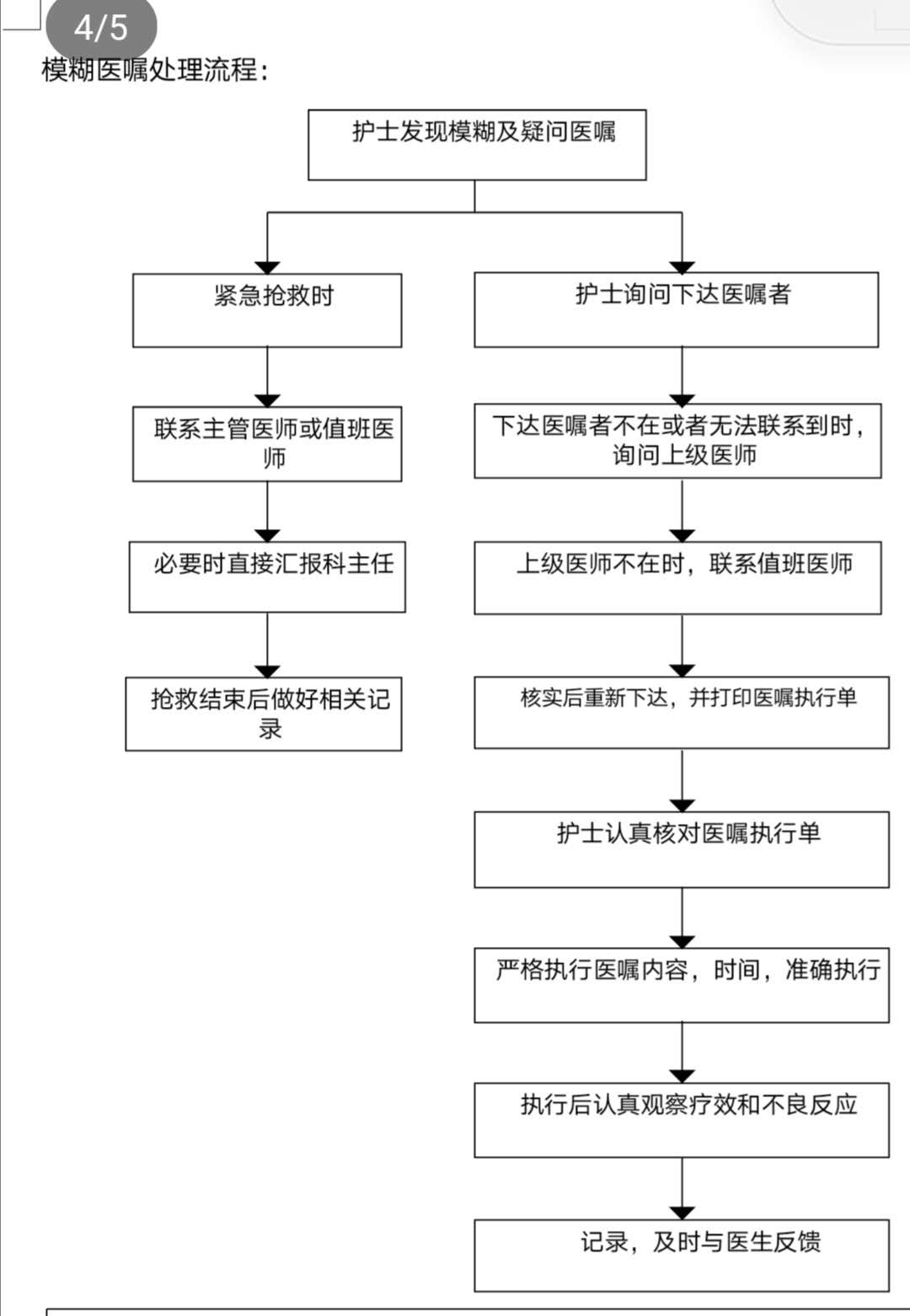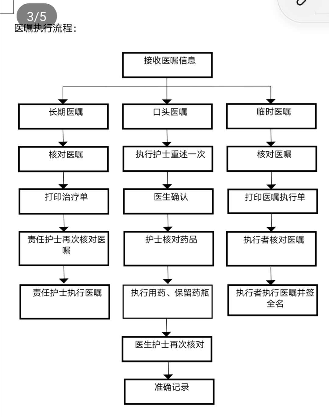 长期医嘱:根据医嘱顺序及频率按时执行,按照“确认→生成→打印各种执行单和医嘱变更单→执行”处理医嘱,每班确认所有医嘱处理完毕。