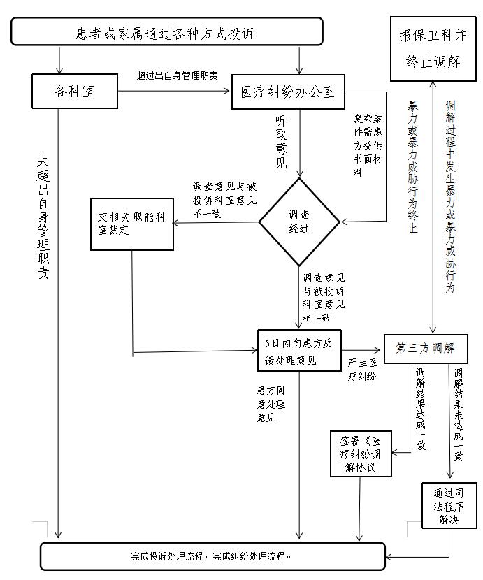5.投诉及时处理:对于当场能协调处理的投诉,应当及时查明情况,当场处理解决;确有差错的,立即纠正,并告知患者处理情况。情况较复杂,需调查、核实的,一般应当于接到投诉之日5个工作日内向患者反馈调查处理情况。涉及多个科室,需组织、协调相关部门共同研究的,应当于接到投诉之日起10个工作日内向患者反馈调查处理情况。