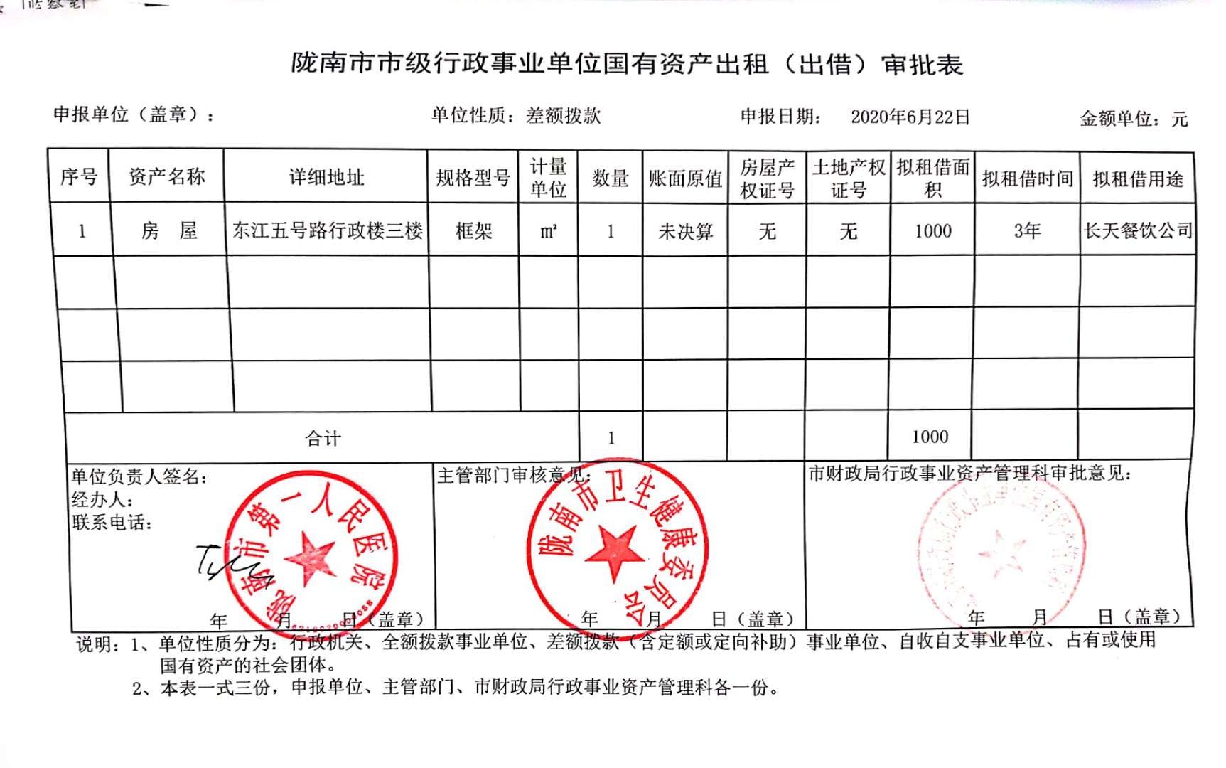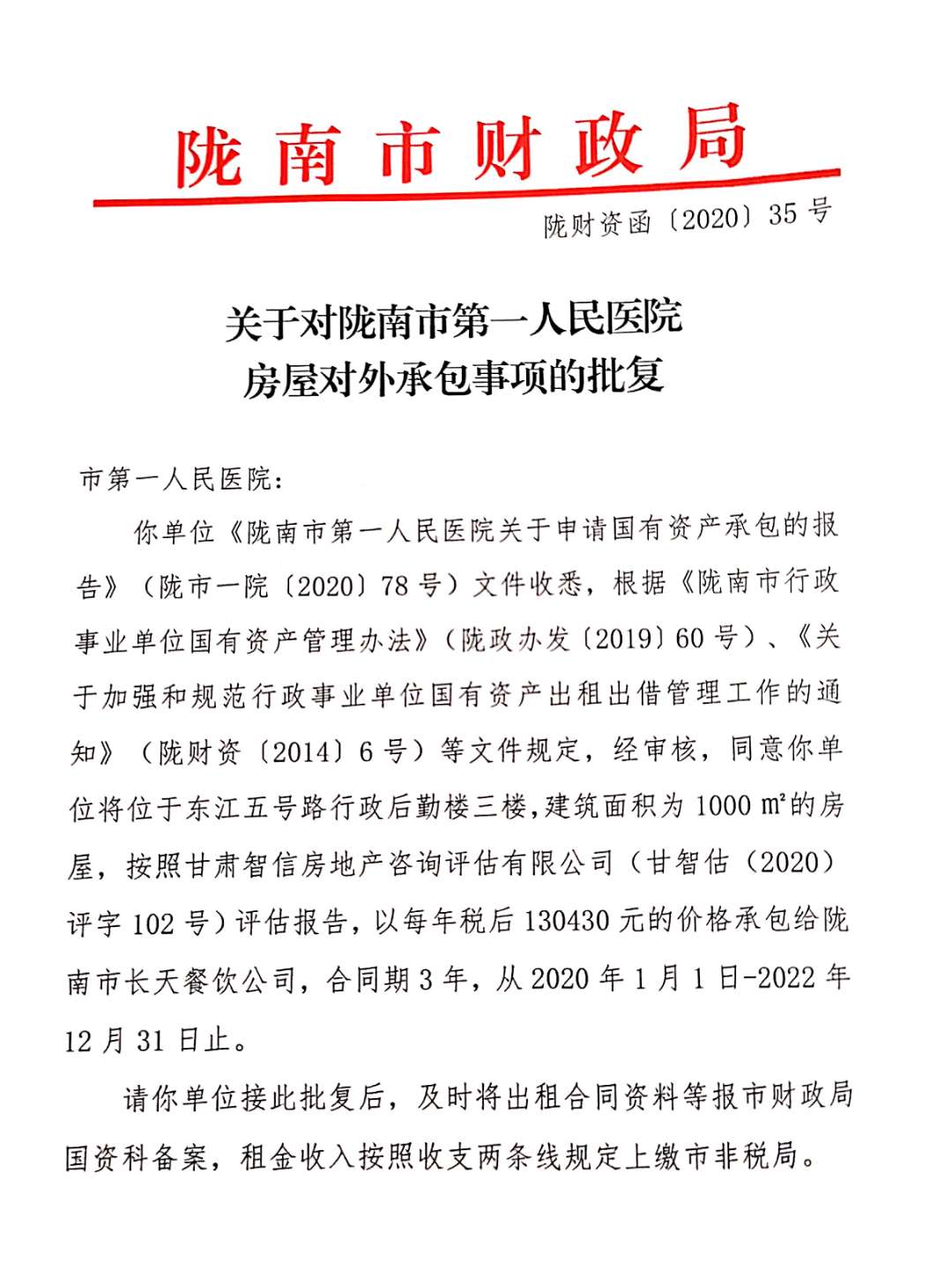 关于对陇南市第一人民医院房屋对外承包事项的批复