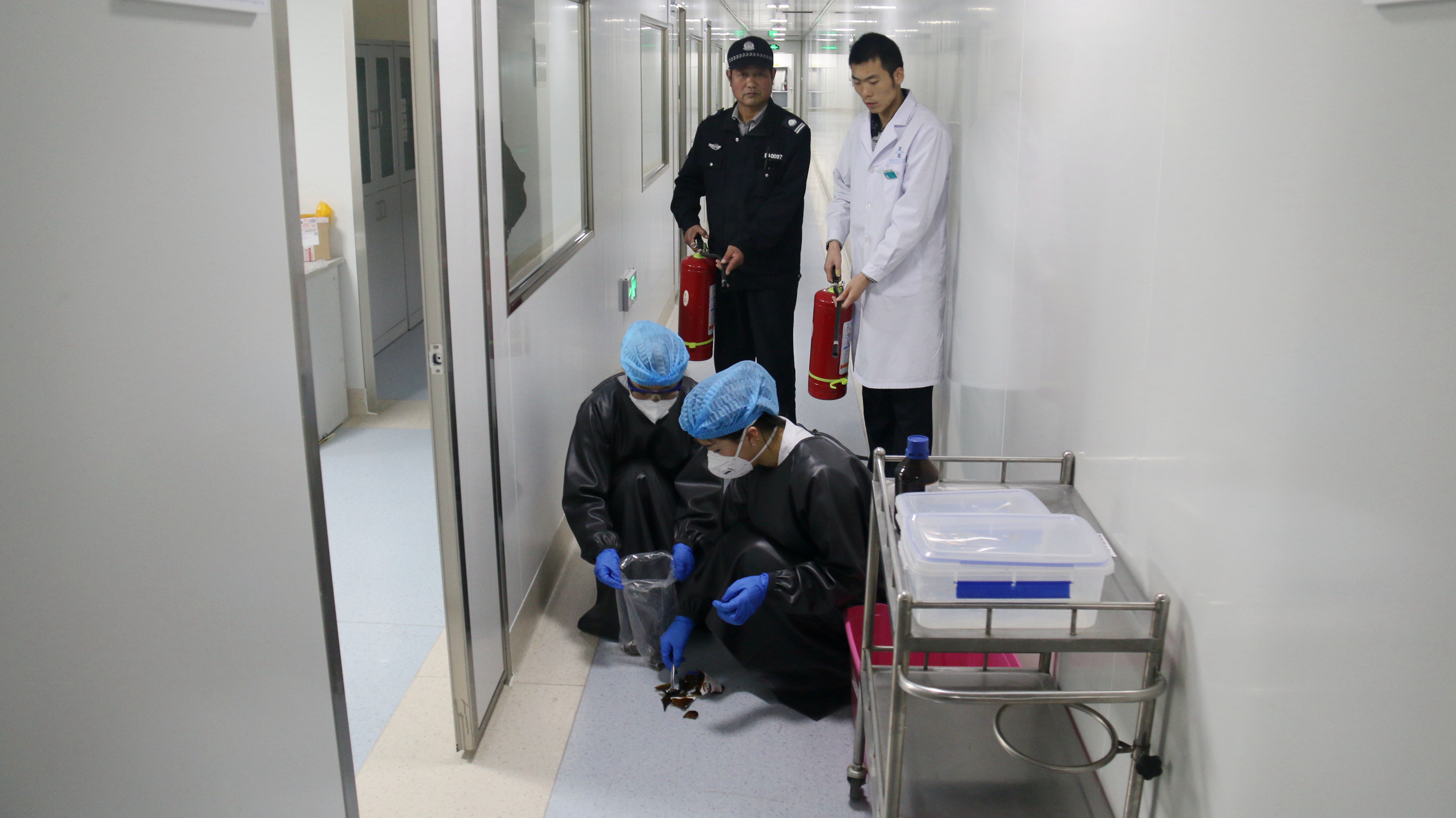 在经过一段时间的培训准备,3月27日,“危化品处理”模拟应急演练在科室拉开了序幕。在模拟现场,一名工作人员用托盘将二甲苯转运至隔壁房间准备更换试剂,在经过走廊时,不小心将二甲苯从托盘跌落、瓶碎、二甲苯外泄。工作人员立即大喊:“二甲苯打破了,大家快来帮忙!、、、、、、、、、、”。演练过程严格按照培训内容进行,整个演练现场气氛紧张、贴近实际、效果逼真,科室职工反应机敏、行动迅速,处置准确得当,演练取得圆满成功。