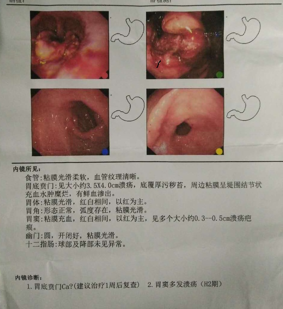 患者,男性,入院前1年无明显诱因出现上腹部胀痛,食物吞咽哽咽。2016年9月曾行胃镜检查提示:1、胃底贲门癌2、胃窦多发溃疡。因入院前1周腹胀、乏力、进食困难明显加重收住医院。