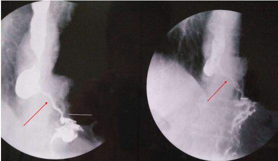 (箭头所指部位明显狭窄,钡剂不能顺利通过)