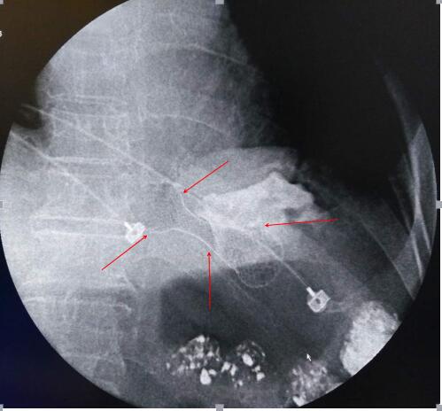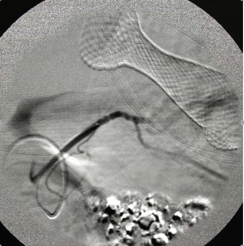 此例手术的成功开展,标志着我院放射科介入微创手术治疗达到了一个新的水平。造影剂顺利通过支架进入胃内