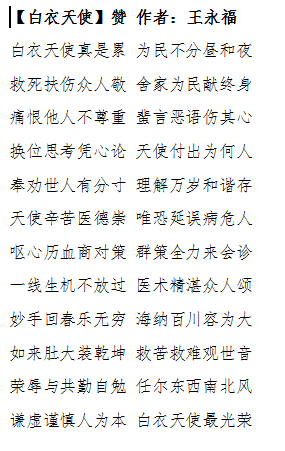 近日,四首精美的诗句送到了我院妇科医生办公室,其中一首《白衣天使》是患者家属写给主治医生冲喜慧、大夫王小平的,句句真情实感,首首感人肺腑。诗中他们都把医生称为神,赞为仙,是什么样的经历使得他们如此不吝溢美之词呢?