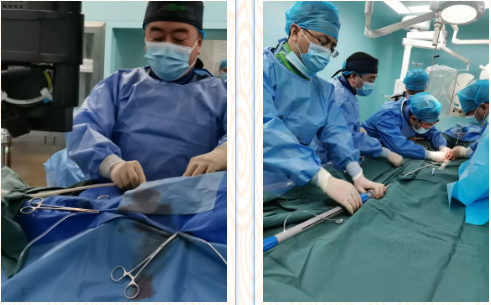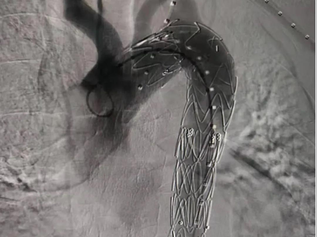 患者入院后,胸外科主任尹义学高度重视,随即邀请麻醉科、ICU、介入科同事进行病情讨论,最终决定行主动脉腔内隔绝术治疗。经过科室严谨的术前准备后,于甘肃省优势学科医联体平台,邀请甘肃省人民医院心血管外科尤涛教授及团队前来会诊指导手术,手术历时2小时顺利完成,取得圆满成功。