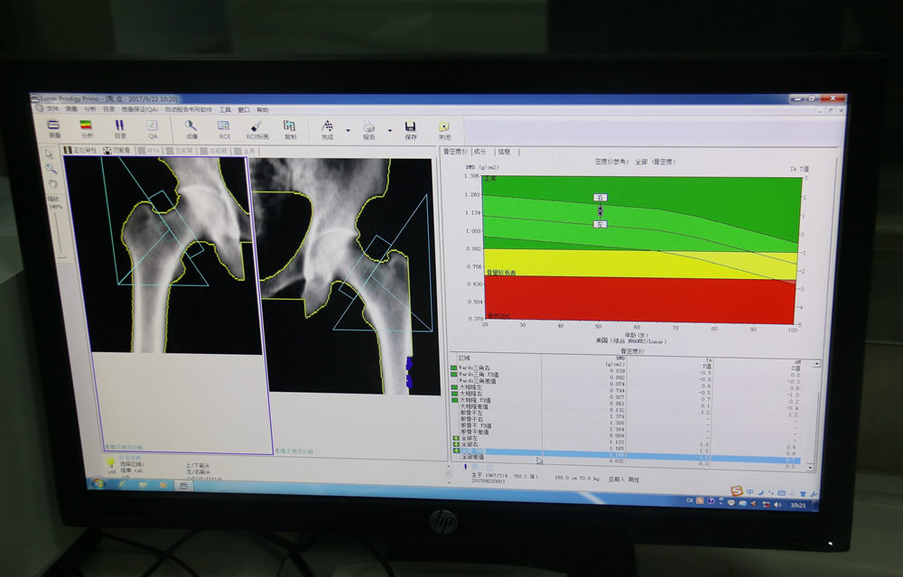 该设备性能先进,可进行全身性检查,检查时间短、精准度高且辐射小;可测量腰椎、股骨近端、全身骨骼等部位骨密度及脂肪组织的含量。