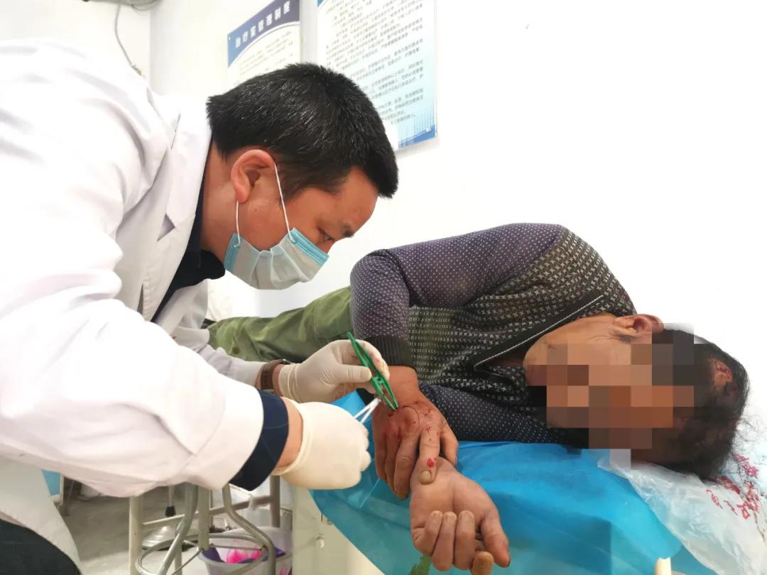 外科医疗队员还为一名高处坠落受伤的村民进行了清创缝合。