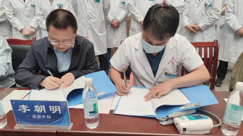 副院长李朝明和文县桥头镇卫生院院长陈占华签署了《医联体合作协议》;并与张镇长共同揭牌。