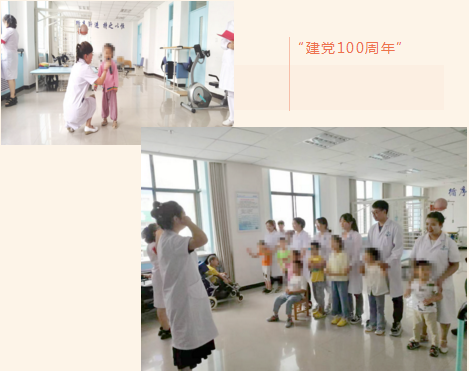 语训治疗师通过带领患儿们唱红歌、讲述红色党旗的来历和含意,让患儿们明白没有革命前辈们打江山、流热血,就没有现在的新中国,使患儿们知道幸福来之不易,需要好好珍惜;家属和患儿一起动手画党旗、红旗,并涂上鲜艳的颜色,爱党、爱国情感就如同种子一样在患儿们心中悄悄萌芽。