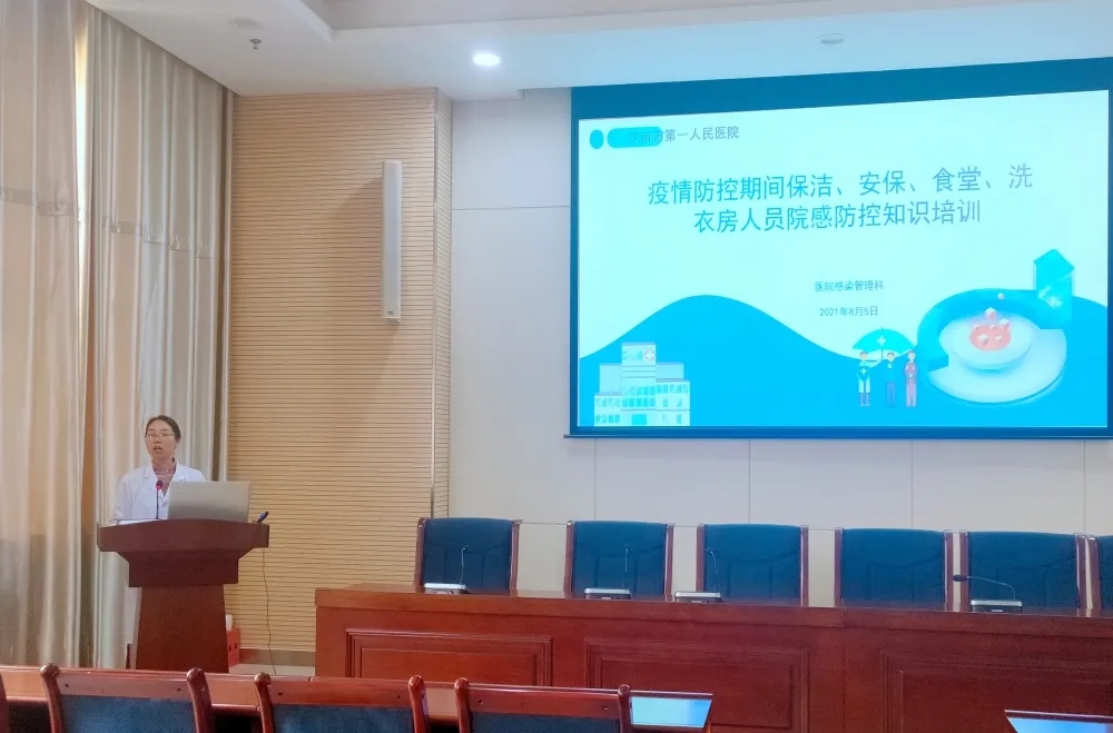 为加强我院新冠肺炎疫情防控能力,有效的预防和控制院内感染的发生,提高保洁、安保、食堂、洗衣房人员对新型冠肺炎疫情防控知识的认识,规范工作流程,确保我院就医环境的清洁、消毒、自我防护措施到位,8月5日下午,医院感染管理科组织开展了疫情防控期间保洁、安保、食堂、洗衣房人员院感防控知识培训。