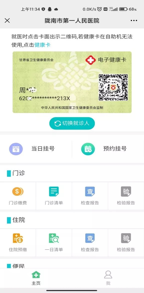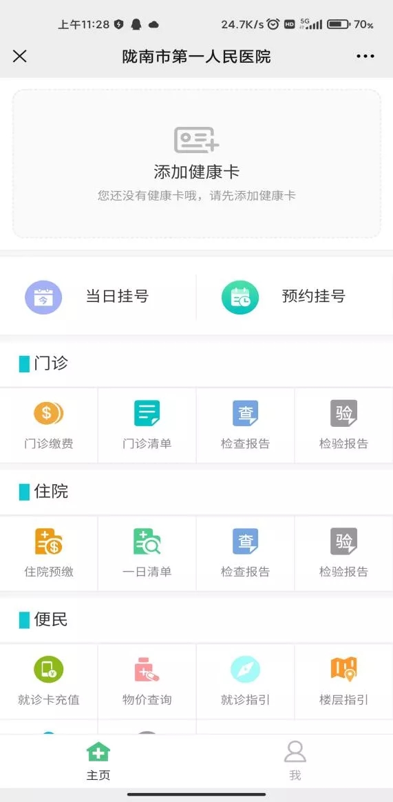 就诊人员可点击页面按钮实现当日挂号、预约挂号、门诊缴费、门诊费用清单查询、检查报告查询、住院预缴、住院清单查询、住院检查报告查询、就诊卡充值、物价查询、就诊指引、楼层指引、来院导航等功能。就医时患者点击二维码,出示即可。