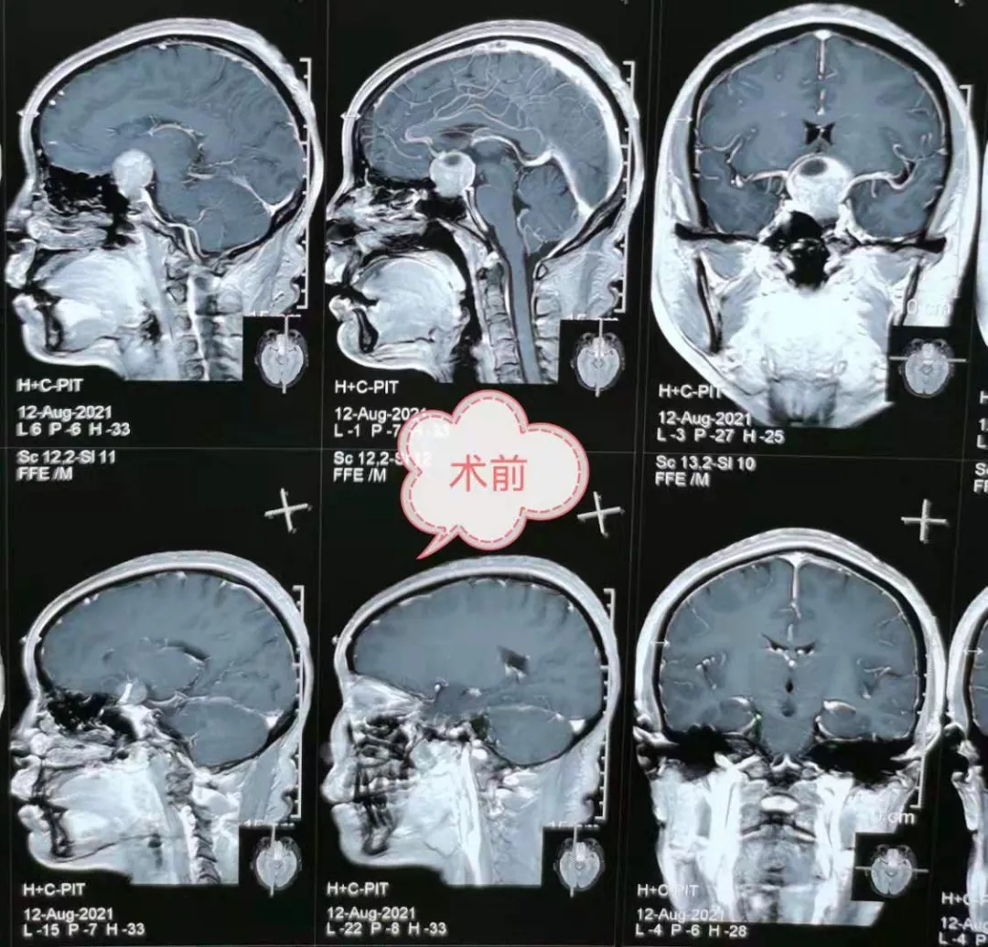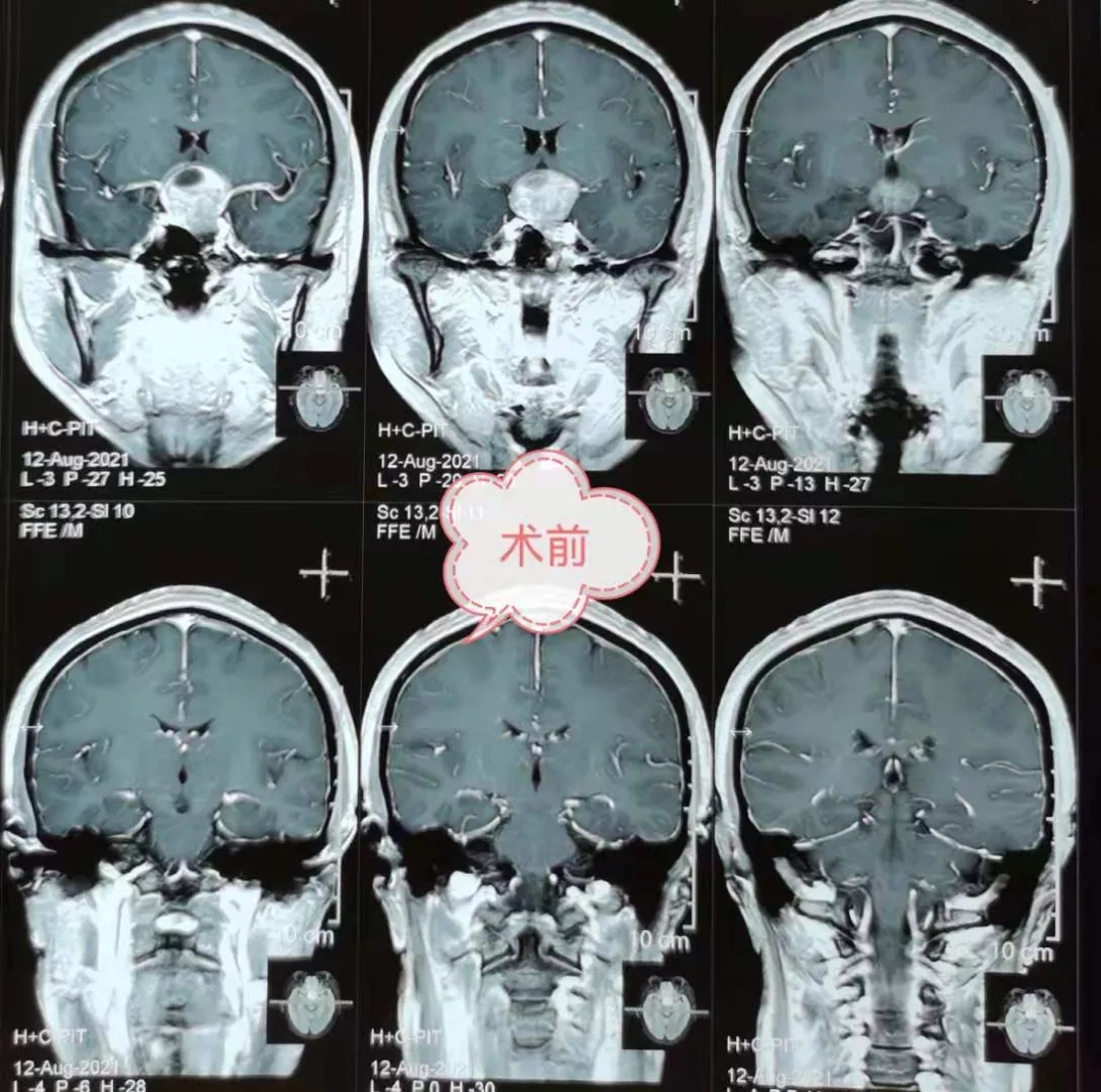 48岁的患者张某,因“渐进性双眼视力减退1年余,加重2月”入院,院前颅脑MRI检查提示:垂体大腺瘤,肿瘤大小约3.1cm×2.3cm×3.0cm。入院诊断:垂体瘤。入院后完善术前检查,科室周小荔副主任积极组织科内人员进行术前反复讨论,决定为患者实施神经内镜下“经鼻蝶入路垂体瘤切除术”。