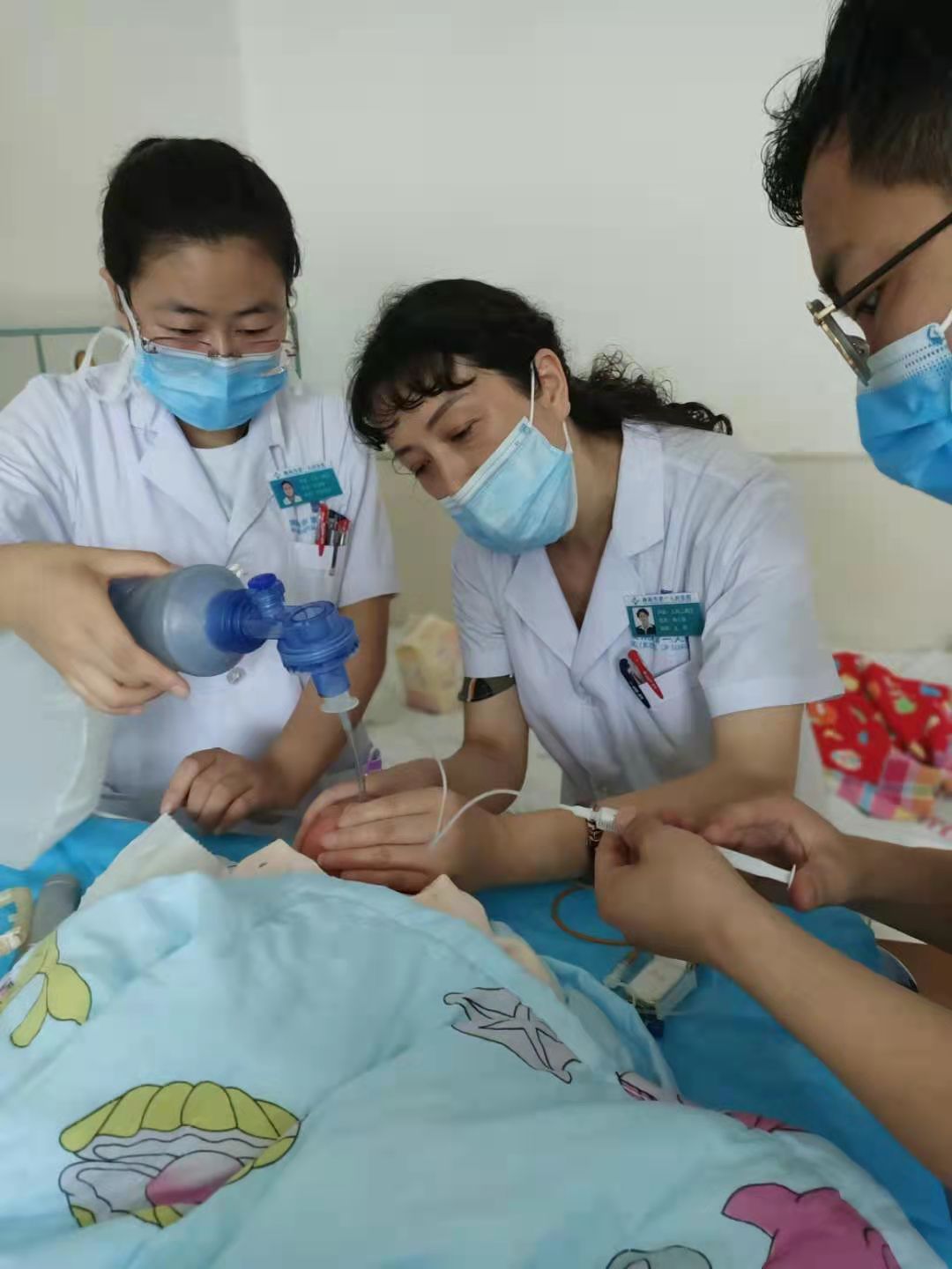 据了解,2021年8月14日,我院儿科二病区收治了一名出生仅1天的小宝宝。小宝宝入科时全身皮肤青紫、呼吸急促、口唇发绀,在别家医院儿科住院治疗1天,症状未缓解,且呻吟、气促、发绀加重,脉氧波动于70%左右,遂由120紧急转入我院新生儿科救治。入科后,科室主任杨云莲立即组织医师团队会诊,最终决定采用有创呼吸支持、外源PS支持为小宝宝治疗。经过控制感染、营养、输血补液等治疗及高年资护理人员专人精心护理,19天后“小天使”病情得到控制,可自行进食,呼吸平顺,氧饱和度稳定,终于回到妈妈的怀抱。看到“小天使”躺在妈妈怀里恬静地抿嘴微笑,“小天使”的全家和新生儿科团队都幸福地笑了。目前,经过新生儿科定期随访了解到“小天使”恢复良好,各方面表现均正常。