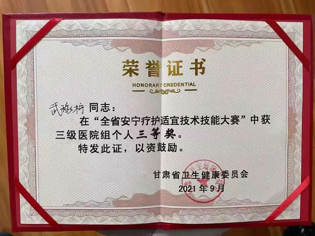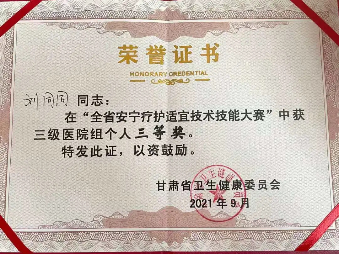 来自全省86家医疗机构的258名选手参赛,其中三级医院53家,二级医院33家,大赛由技能操作和理论知识考核两部分组成,其中技能操作包含PICC维护技术、口腔护理和鼻饲三项内容。自比赛通知下发以来,我院积极组织,选拔优秀护理人员刘婷、武稼柠、刘同同组成参赛队,参赛选手赛前精心准备、刻苦训练,经过激烈角逐,我院参赛队荣获三级医院“团体三等奖”,参赛队员刘同同、武稼柠荣获“个人三等奖”。