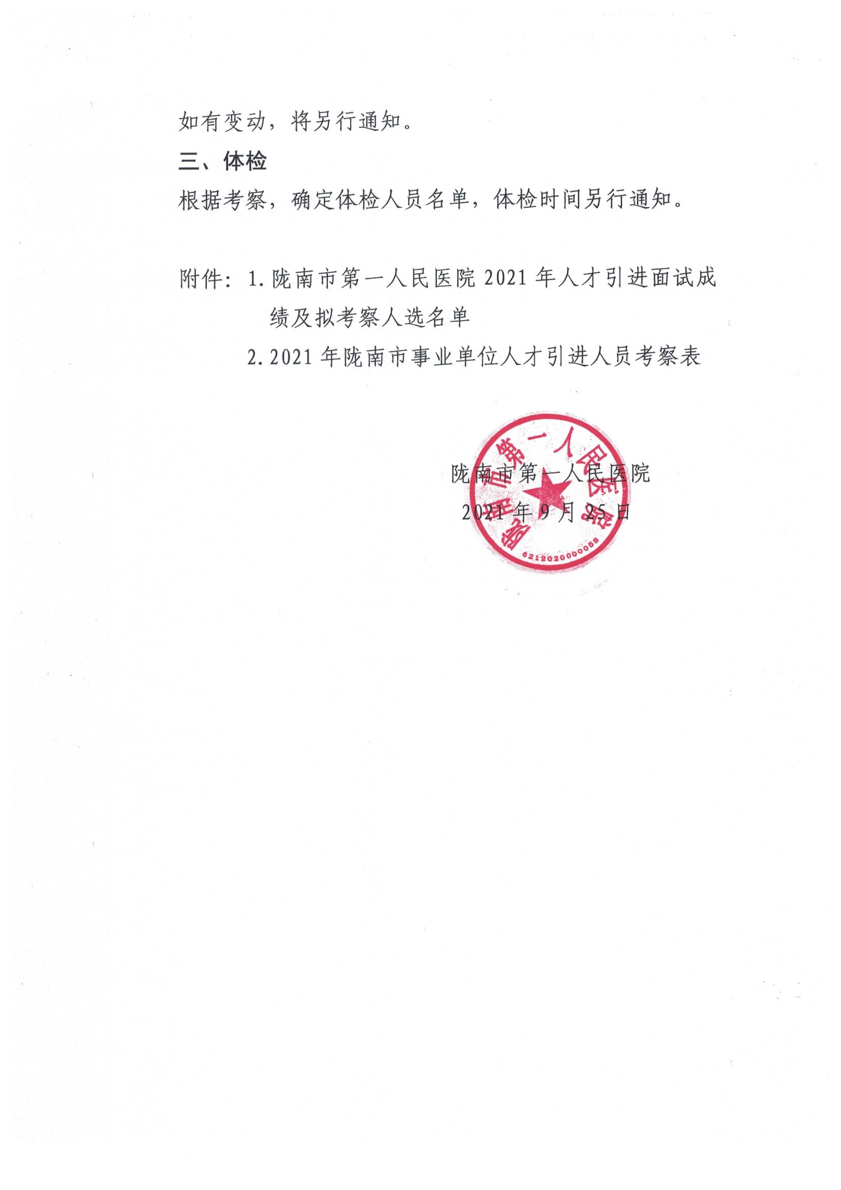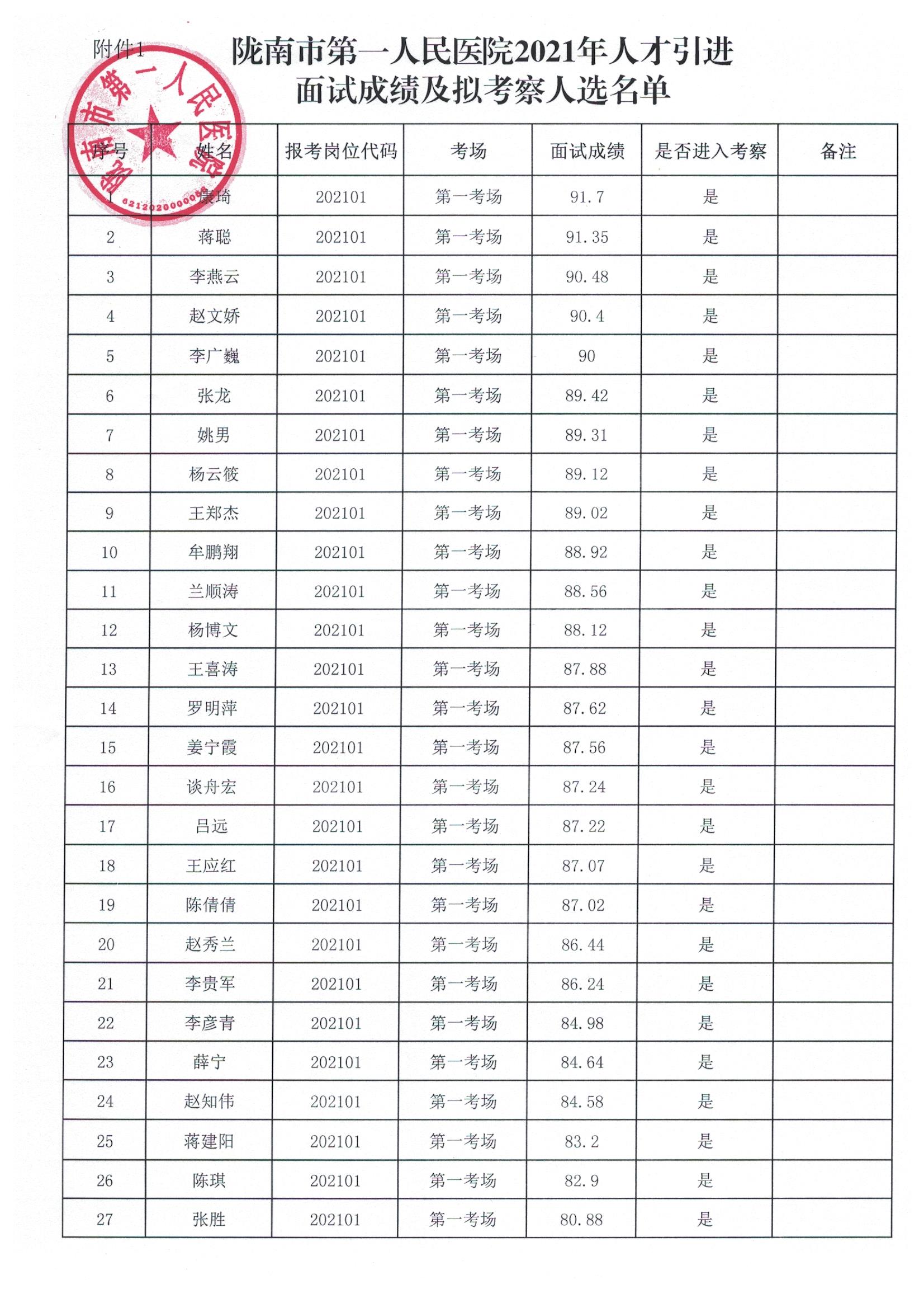 陇南市第一人民医院关于2021年人才引进 面试成绩及拟考察人选名单公示的公告